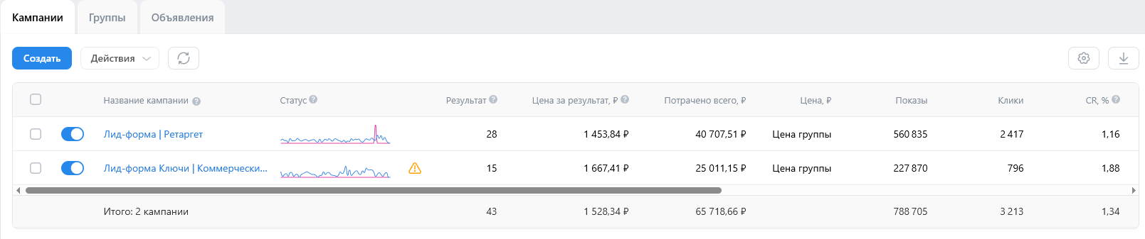 Структура: 3 рекламные кампании на получение лидов и трафика на сайт